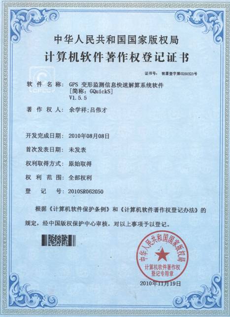 GPS 变形监测信息快速解算系统软件——GQuickS 1.5.5(简称GQuickS软件)以GPS监测网基准时段观测获得的基准坐标为基础,以“似单差”理论为基础,利用监测时段的单历元观测值,高精度、快速解算监测点的变形信息。软件具有卫星轨道拟合、卫星位置和速度计算、钟差改正、天线相位中心偏差改正、对流层与电离层延迟改正、DOP值计算、坐标系统换算、单历元变形信息解算、抗差估计、Kalman滤波、精度评定、图形与文档成果输出等功能。